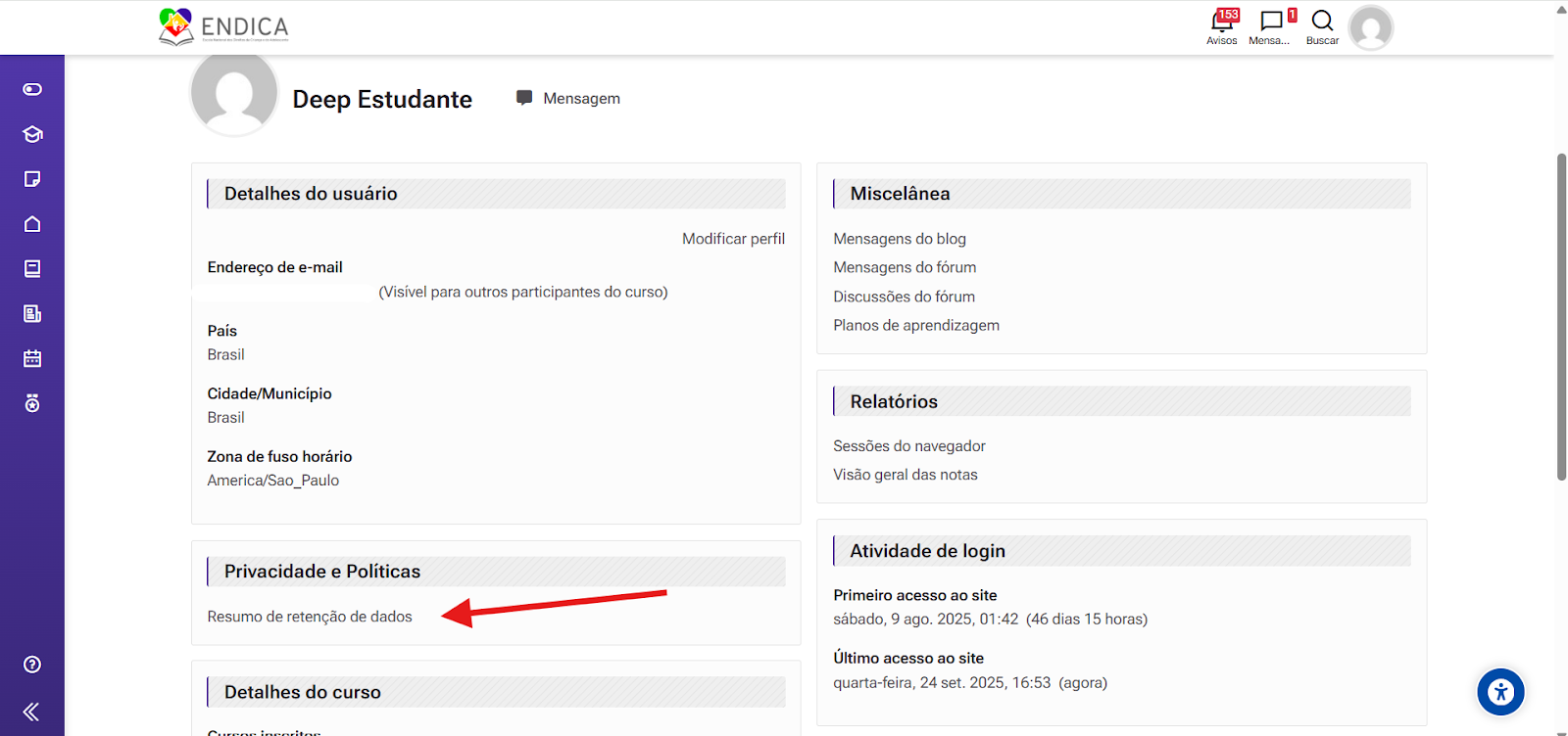 Este tutorial orienta como solicitar a exclusão dos seus dados pessoais na plataforma ENDICA, de acordo com a Lei Geral de Proteção de Dados (LGPD). É útil quando você deseja que seus dados sejam removidos do sistema ou não sejam mais utilizados para finalidades relacionadas ao curso.